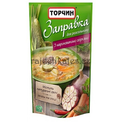 Složení: pitná voda, nakládané okurky, jedlá sůl, cukr, sušené cibule, zahušťovadlo (E-1422), sušená mrkev, slunečnicový olej rafinovaný a dezodorizovaný, regulátor kyselosti (kyselina octová), pastinák kořen, sušený česnek, látka zvýrazňující chuť (Inosinát a guanylát sodný), sušený kopr, přírodní kukuřičná chuť, kurkuma, červený pepř (hořký), extrakt z černého pepře. Může obsahovat stopy mléka, sóji, vajec, hořčice a lepku.