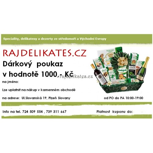 Hodnota poukazu bude odečtena z celkové částky za vybrané zboží v interentovém obchodě www.Rajdelikates.cz nebo na kamenném obchodě Ráj delikates.