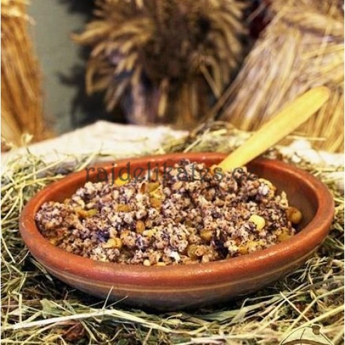 Ингредиенты: 250 г зерен пшеницы, 150 г изюма без косточек, 150 г нарезанных плодов инжира, 100 г меда. Приготовление: зерна пшеницы сварить до размягчения, но чтобы они оставались целыми. Изюм и инжир хорошо промыть, залить холодной кипяченой водой и дать набухнуть. Затем все соединить, добавить мед и перемешать.