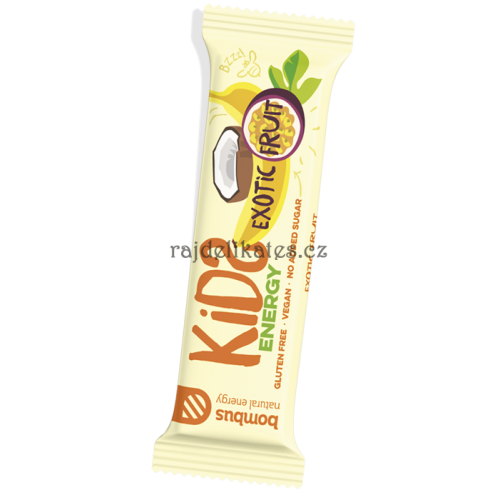 Exotic Fruit BOMBUS v této tyčince pro děti připravil speciální mix úžasné chuti a opravdového exotického ovoce. Prvotřídní dobrota s obsahem banánu, datlí, kokosu, maracuji a pohanky. Atraktivní chuť a pečlivě vybrané přírodní suroviny dělají z této tyčinky jasného favorita dětského mlsání. Tato tyčinka dětem dodá také dostatečný obsah vlákniny, minerálu, vitamínu a antioxidantu. Obsah přirozeně se vyskytujících cukrů navíc nepřetěžuje trávicí systém a organismus.