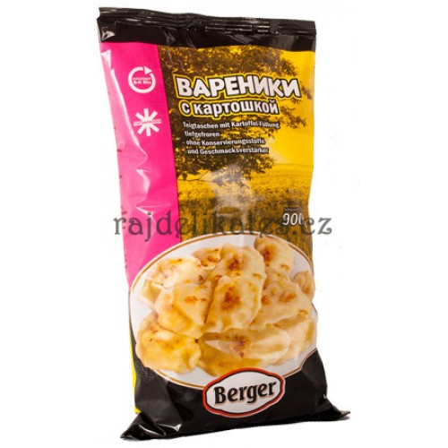 Složení: těsto 50% (pšeničná mouka 83%, pitná voda 12%, sušená vejce 3%, řepkový olej, jedlá sůl), bramborová náplň 50% (brambory 83%, pitná voda, cibule pečená, černý pepř, jedlá sůl).