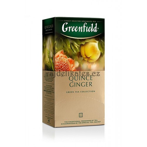 Složení: zelený čaj 86 %, zázvor kořen 9 %, kdoule 1 %, měsíček list 0,5 %, aroma (zázvor, kdoule)