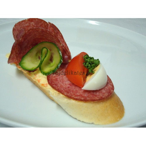Složení: veka, salát výrobní, šunka, vejce vařené, okurka salátová, rajče, petržel nať