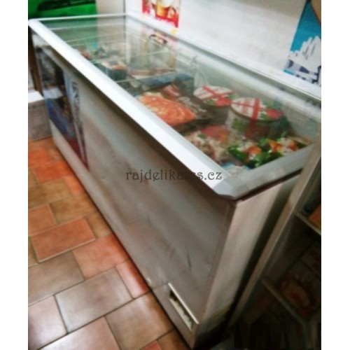 Prosklený mrazák, stále v provozu, objem 600 l.Znamky používání.